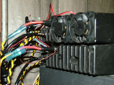 This is a rear view of the link radios, sorry about the messy wiring, havent had time yet to clean her up. The top radio is the St. Louis radio runing 25w (hense the dual fans to keep her cool), and the lower radio is the Mascoutah radio running about 50mw into a 1/4 wave antenna.