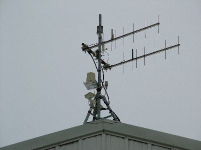 This is the link antenna to St. Louis, it is a stacked set of 7el uhf beams. I constructed the phasing harness and bracketing, I am estimateing about 12db of gain. Im not for sure of the gain but I know the it hauls the mail. The antenna for the mascoutah link radio is a small 1/4 wave UHF antenna on a magmount.